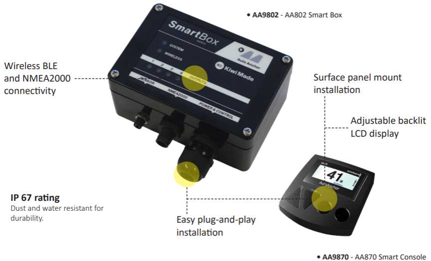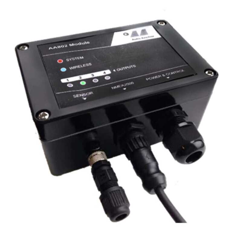 TThe Auto Anchor AA802 Smart Box is the heart of your anchoring system, delivering precise monitoring of rode length by tracking chain and rope movement through the windlass. Built for seamless integration, the AA802 communicates over BLE or NMEA2000 with compatible chart plotters and multifunction displays. For vessels without a compatible onboard display, the AA870 Smart Console can be paired with the AA802 to provide a dedicated screen and user-friendly controls. While optional, it offers a straightforward, self-contained solution for monitoring rode length and adjusting system settings.