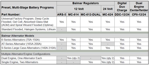 The Balmar Max Charge MC-624 is the latest generation of smart, multi-stage Balmar Max Charge voltage regulators. Designed to provide precise voltage control for Balmar high-output 24-volt alternators and other externally regulated P-type alternators, the MC-624 features user selectable programs for the following battery types: Deep cycle flooded, standard flooded, gel, AGM, spiral wound AGM, and LiFePO4 batteries. In addition, the regulator features a universal default program that’s safe for most battery types, as well as a program that’s designed for use in vessels utilizing voltage sensitive halogen equipment. In addition to the user selectable preset programs, the MC-624 features a wealth of advanced programming modes which make it possible to tailor charging to a wide variety of environments. When used in conjunction with optional MC-TS-A and MC-TS-B alternator and battery temperature sensors, the MC-624 features the ability to monitor and respond to a range of ambient temperature conditions, including reduction or discontinuation of charging voltages, should a catastrophic over-temperature condition occur at the alternator or the batteries
