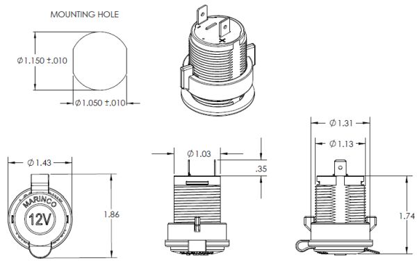 Construction: Provided with pvc cap to seal receptacle when not in use. Sealing ring on Marinco Sealink plug (cat. no. 12VPG) provides weather seal while in use. Receptacle provided with recesses to lock Marinco Sealink plug to prevent inadvertent disconnection; disengages when plug is rotated 30º.