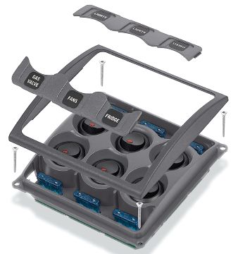 TC fuses are accessible from the front cover. The BEP Contour 1000-6W 6-Way Switch Panel With Fuses has Square dimensions allow for modular mounting of multiple panels in vertical or horizontal configuration.