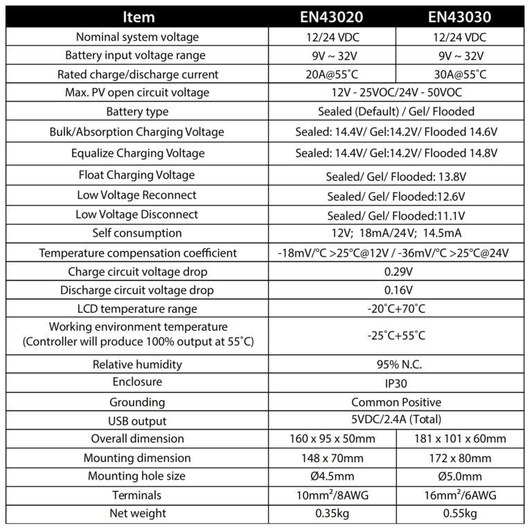 - Informative backlight LCD display indicates solar charge input, charge/load output Volatage/Amps