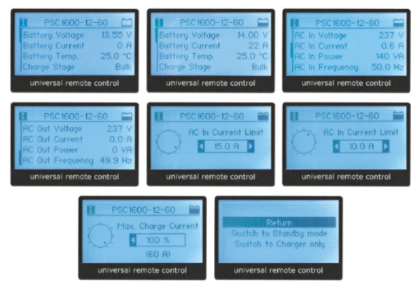 The Universal Remote Control (URC) can be used to remotely readout all available parameters from your ePRO inverter/charger Combi, like charging current, output voltage, charge stage etc. It is also possible to put the Combi in standby mode or to wake it up again, besides being able to control the maximum charge current and the maximum AC input current. All information is shown on a clear white backlit graphical display. This kit comes with mounting screws and a 3 meter interface cable (standard cat5 patch cable). The URC automatically recognizes to which type of equipment it is connected.