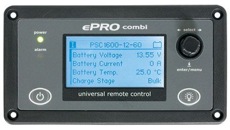 The Universal Remote Control (URC) can be used to remotely readout all available parameters from your ePRO inverter/charger Combi, like charging current, output voltage, charge stage etc. It is also possible to put the Combi in standby mode or to wake it up again, besides being able to control the maximum charge current and the maximum AC input current. All information is shown on a clear white backlit graphical display. This kit comes with mounting screws and a 3 meter interface cable (standard cat5 patch cable). The URC automatically recognizes to which type of equipment it is connected.