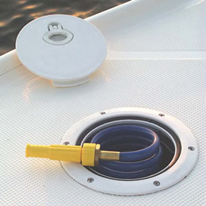 Hatch enclosure mounts flush in the deck or bulkhead. Twist lock lid removes from the enclosure for easy access and has a draw string to prevent accidental loss. The hatch is fully enclosed underneath and is fitted with a 12mm hose tail for drainage. All kits include hose and hose spray nozzle.