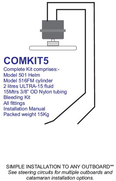The COMKIT5 features the front-mount style cylinder: Model 516FM and is suitable for leisure boats with single outboards up to 200HP or twin outboards up to 400HP TOTAL (counter-rotating).