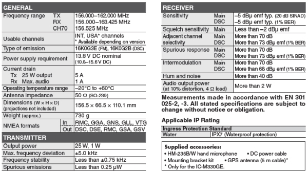 • Built in Class D DSC – The IC-M330 radio monitors CH 70 continuously, even while you are receiving another channel. DSC functions include: distress, individual, group, all ships, urgency, safety, position request/report, polling request and DSC test calls.