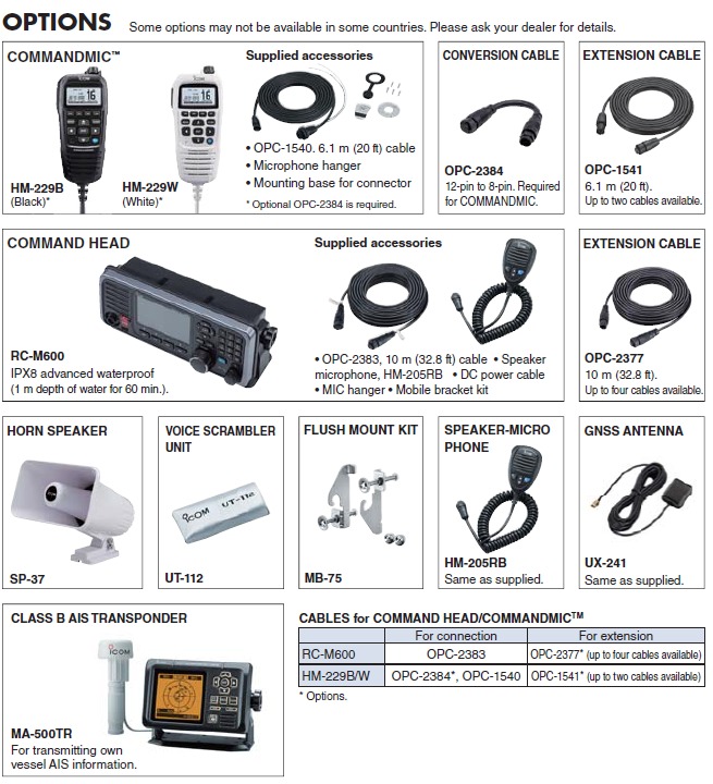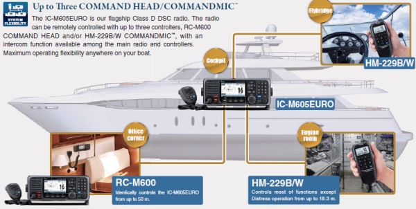 - Up to Three COMMAND HEAD/COMMANDMIC – The IC-M605EURO is our flagship Class D DSC radio. The radio can be remotely controlled with up to three controllers, RC-M600 COMMAND HEAD and/or HM-229B/W COMMANDMIC™, with an intercom function available among the main radio and controllers. Maximum operating flexibility anywhere on your boat.