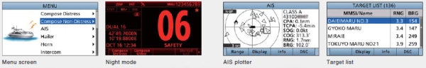 - Integrated AIS Receiver –how real-time AIS vessel traffic information on the display. The AIS combo screen enables you to monitor the AIS plotter during basic operation. You can directly call a selected AIS target from the AIS screen using an individual DSC call.