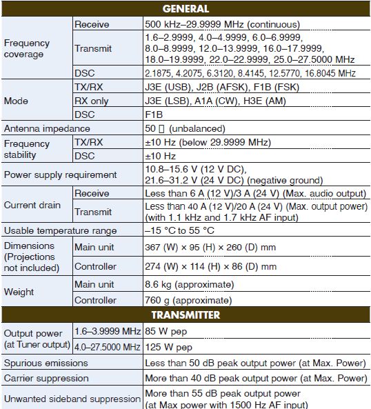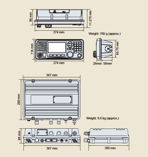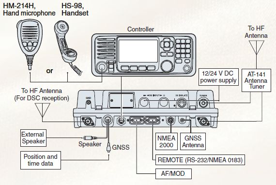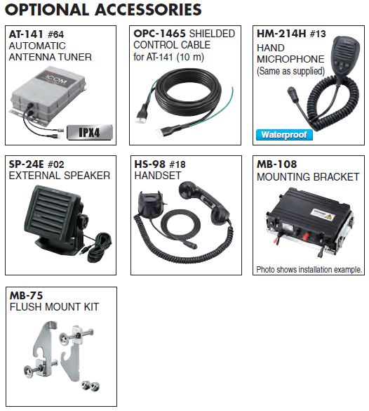 Supplied Accessories: Hand Microphone HM214H, DC Cable, GNSS Antenna, Remote controller & control cable, Mounting plate for main unit and Mounting bracket kit for the remote controller