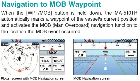 - Navigation to MOB Waypoint – When the [WPT/MOB] button is held down, the MA-510TR automatically marks a waypoint of the vessel's current position and activates the MOB (Man Overboard) navigation function to the location the MOB event occurred.