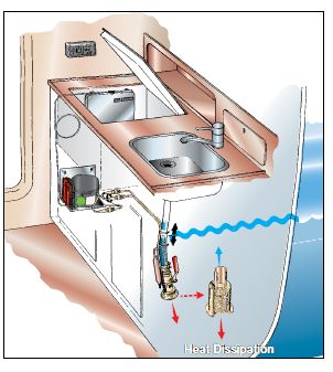 The Isotherm SP unit uses the movements of the hull to draw heat down and out through a special fitting in the galley sink drain hose. The flow is completely free inside the draining hose, so each movement of the surrounding water produces a similar quantity of water level inside the hose, which results in pumping an equivalent amount of water in and out. By designing a special hull fitting containing a non restricting, fullflow spiral heat exchanger for cooling the heated refrigeration agent, an extremely efficient cooling system is created.