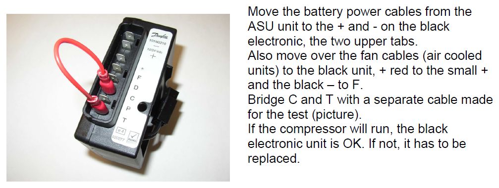 • The compressor should run continuously at low speed when terminals T and C are connected. This will confirm that the electronic module is OK and that the power supply is adequate for low speed operation. If the compressor does not run or runs intermittently, starting and stopping after a few seconds, this may be caused by a poor power supply or a faulty electronic unit. To test the power supply, use a digital voltmeter. Measure the voltage at the electronic unit with the compressor off and note the voltage. Measure the voltage again with the compressor starting or running – the voltage should drop no more than 0.5V – if there is more than 0.5V drop, check all the terminals and connections carefully fort good contact, tightness and signs of corrosion. It can be helpful to connect a separate test power supply. Run separate wires (both positive and negative) directly to the batteries and re-test the power supply. Ensure the wire size is adequate for the length of run.
