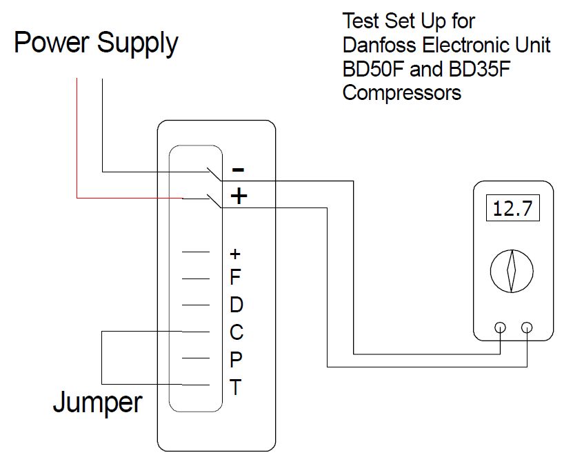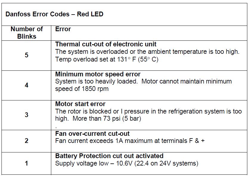• Danfoss has a built in Error Code System that can be helpful in diagnosing a specific problem. To display the error code and LED (light emitting diode) must be connected between the + and D terminals on the electronic control module. The exact error is determined by counting the number of times the LED blinks. See below for code info.