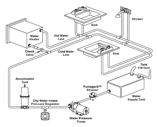 The accumulator tank is pre-charged at 10 psi (0.7 bar). If your pump’s electric pump cut-in pressure is significantly different, you may adjust the tank pressure to better suit your particular installation. To increase air pressure in tank, shut pump off, open a faucet to relieve system pressure, and adjust precharge pressure using ordinary tire gauge and tire pump at valve in end of tank. Pressure should be checked regularly. To check tank pressure: turn off power to water pump, open a faucet to relieve pressure. Check tank pressure, adjust if necessary. Close faucet and turn on power to pump. For best results, do not pressurize tank above 20 psi (1.4 bar).