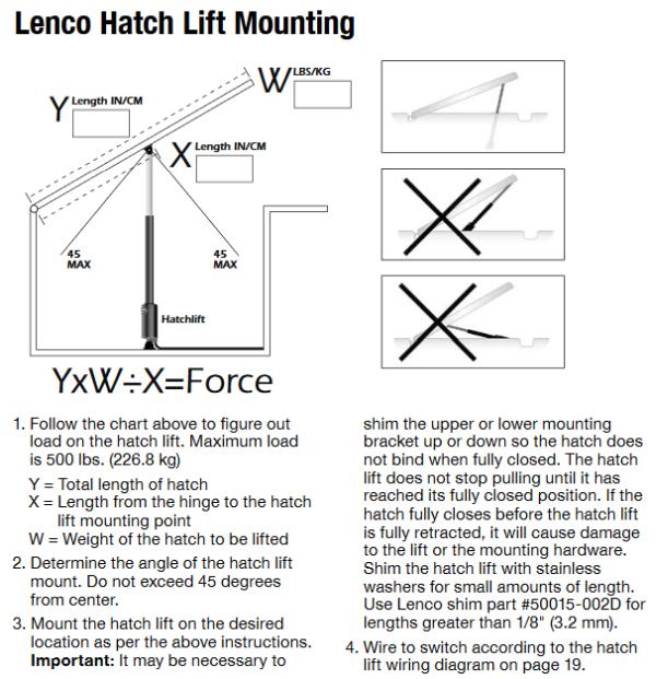 • The hatch lift must be allowed to free spin at both ends of its stroke or it will continue to push or pull against any resistance potentially damaging the hatch lift or the hatch itself.
