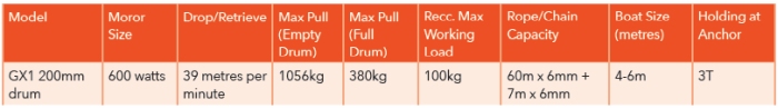 The GX1 is the fastest and most powerful 200mm drum anchor winch on the market today. Thanks to the well oversized gearing (4 times the surface area of gearing in other 200mm drum winches) and 600W motor this micro unit can easily be fitted to boats to 6m for saltwater use and much larger for freshwater applications.