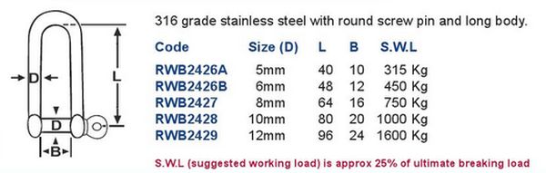 316 grade stainless steel shackle with long body. Screw in pin drilled for security tie wire.
