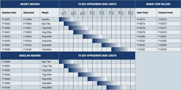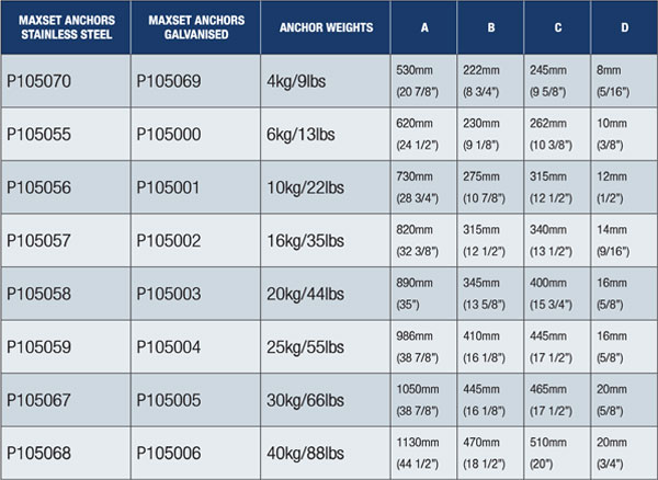 The “MAXSET” galvanised and stainless steel (AISI 316) anchor range, based on the proven ‘Plough’ design is available in four different sizes to suit boats from approximately 4m (15’) to 17 m (55’)