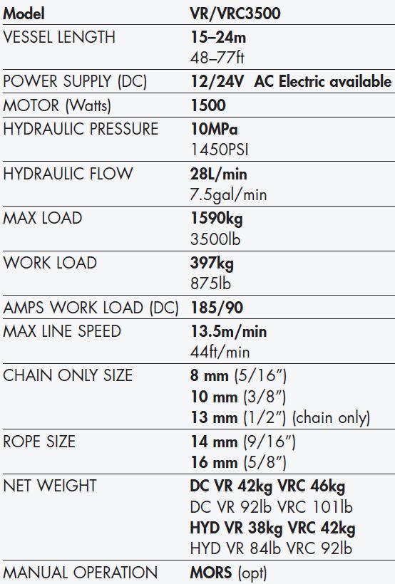 - Muir Storm VRC3500 Vertical Stainless Steel Anchor Winch with Capstan –Â 3PH/50HZ 1.85KW AC – Suits 10mm SL Chain and 16mm Rope