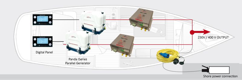 Panda iSeries generators are the first of the next generation of compact, super silent and powerful generators while supplying extremely stable voltage and frequency and high starting capacity for air conditioning loads. When weight distribution plays a critical role, two smaller iSeries parallel generators can be installed onboard. Their power can be combined to provide the same performance which would only be available using a single large generator.
