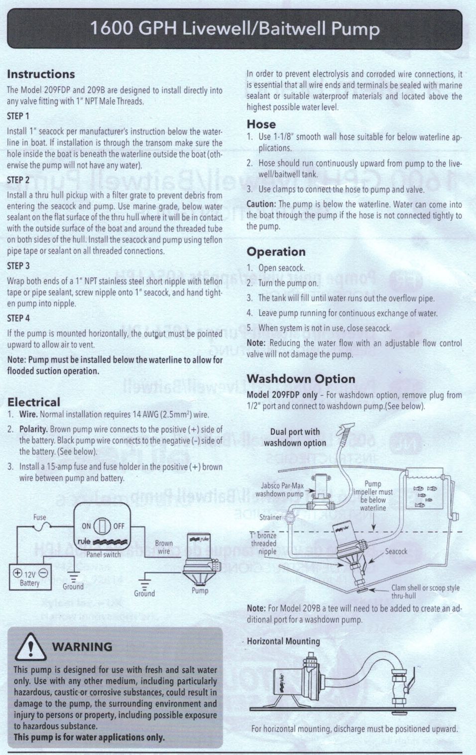 The Rule 1600GPH Dual Port Tournament Livewell Pump is a very heavy duty, high capacity livewell pump for the serious fisherman, engineered to withstand the rigours of tournament fishing. This high capacity 1600 GPH (6050 litre per hour) model features a heavy duty long-life motor, anti-airlock feature and a strong glass-filled nylon dual port base for optional washdown pump 1" NPT female intake underneath base with 1/2" female washdown pump inlet connector and 28mm (1 1/8") hose discharge outlet. 12 volt only. Includes threaded plug for washdown intake port. 3 year limited warranty.