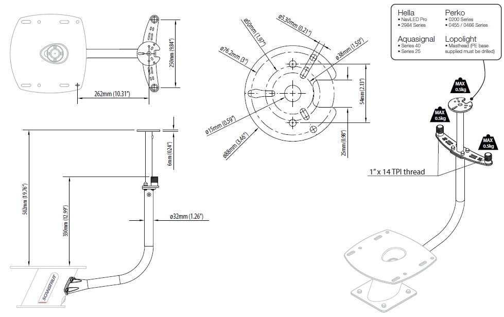 Scanstrut - Antenna and Light Mount CENTRAL WING PLATE - Designed for 2 x Antenna and 1 x Navlight