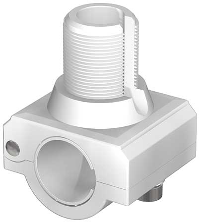 This sturdy plastic mount attaches to 7/8" and 1" horizontal rails and has a side slot in the 1"-14 thread section for antennas with coax exiting the bottom center of their ferrule.