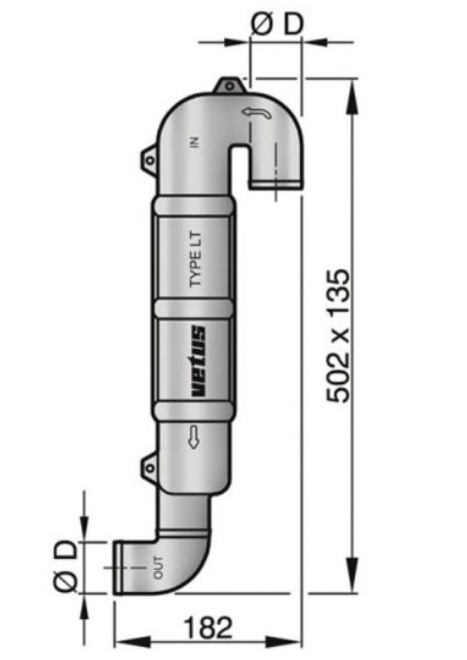 Available for exhaust hose of Ø 40 mm, Ø 45 mm, Ø 51 mm or Ø 60 mm I.D. This gooseneck raises the exhaust line above the waterline and also provides additional noise reduction. The outlet fits directly to VETUS rubber transom connectors.