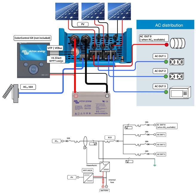 - AC distribution – The AC distribution consists of a RCD (30 mA/16 A) and four AC outputs protected by two 10A and two 16A circuit breakers.One 16A output is controlled by the AC input: it will switch on only when AC is available.