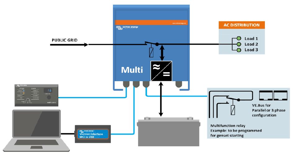 - Parallel and three phase applications can be configured with VE.Bus Quick Configure and VE.Bus System Configurator software.