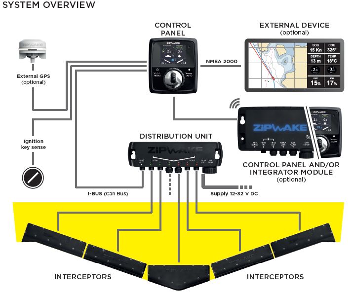 - 0582150 – External GPS – The Zipwake’s standard Control Panel has a built-in internal GPS. When this is located inside the vessel and cannot receive a clear signal, it is recommended to install an external GPS receiver. The GPS signal provides accurate vessel position and speed; necessary input for the Zipwake’s automatic motion controller (2011240)