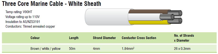 Quality tinned Three Core Marine cable with extra white sheath. This cable is excellent for wiring boats and caravans with corrosion resistant tinned copper wire.