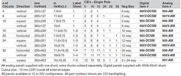 - All panels available in 12 or 24V configuration. All part numbers shown are 12V backlighting.
