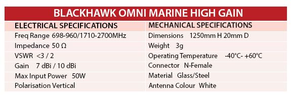 The Blackhawk Omni Marine High Gain Antenna is designed for versatility, for use in a variety of environments, in low to high signal areas and mounted in a marine environment. The Blackhawk Omni Marine Antenna will operate with all mobile carriers regardless of the frequency they operate on. With a 7 - 10 dBi gain and supporting all bands, this antenna is hard to beat and will provide the perfect solution for voice and data applications where high gain marine antennas are required.