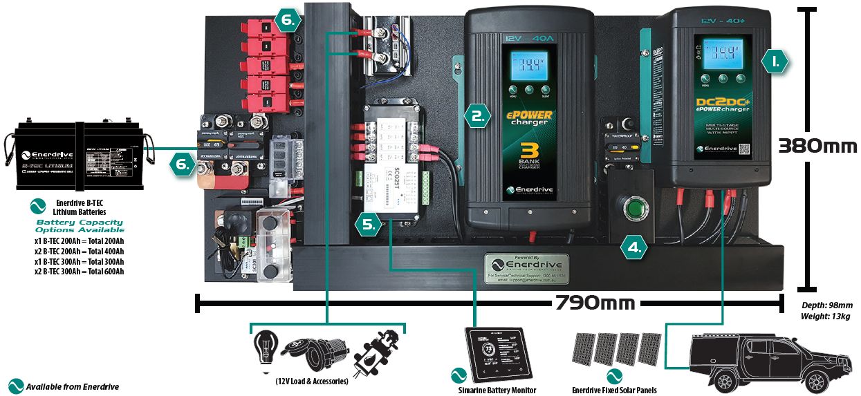 Incl. 40A AC Charger, 40A DC Charger, MPPT Solar Charger, Simarine LCD Battery Monitor, Fuses and Low Battery Protection