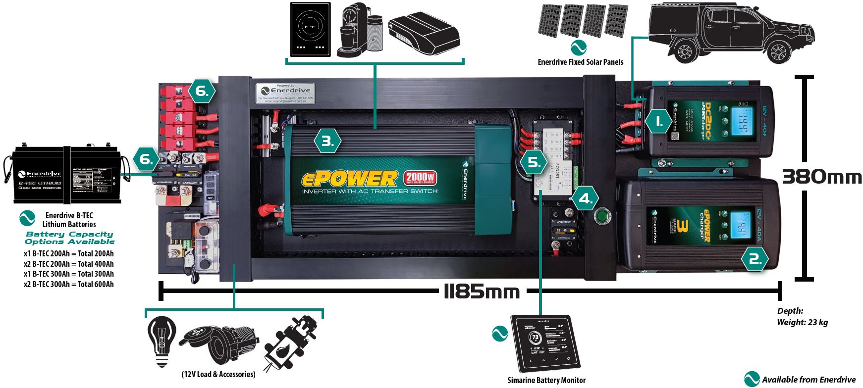 Enerdrive have created many different layouts and dimensional sizes to fit nearly every possible application. Designed for the DIY handyman with basic electrical knowledge through to the professional looking to save installation time. From small systems with AC & DC charging and battery monitoring up to systems with 2000w inverters and individual charge/load monitoring.
