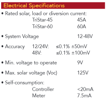 Morningstar's TriStar™ is a three-function controller that provides reliable solar battery charging, load control or diversion regulation. It is rated at 45 or 60 amps, both at 12-48 volts, and has an optional meter, remote meter and remote temperature sensor.