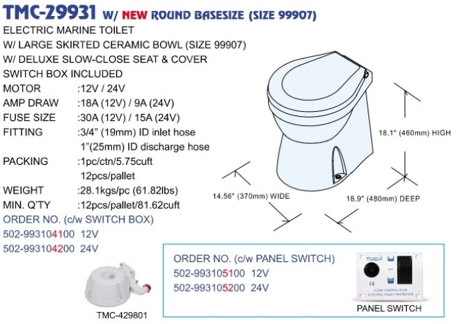 - - Incl. Base, Motor, Macerator and Switch (Can also convert manual TMC Toilet into Electric Toilet)CONVERTION KITS FOR ELECTRIC TOILET MODEL #99907, 99909 & 99910