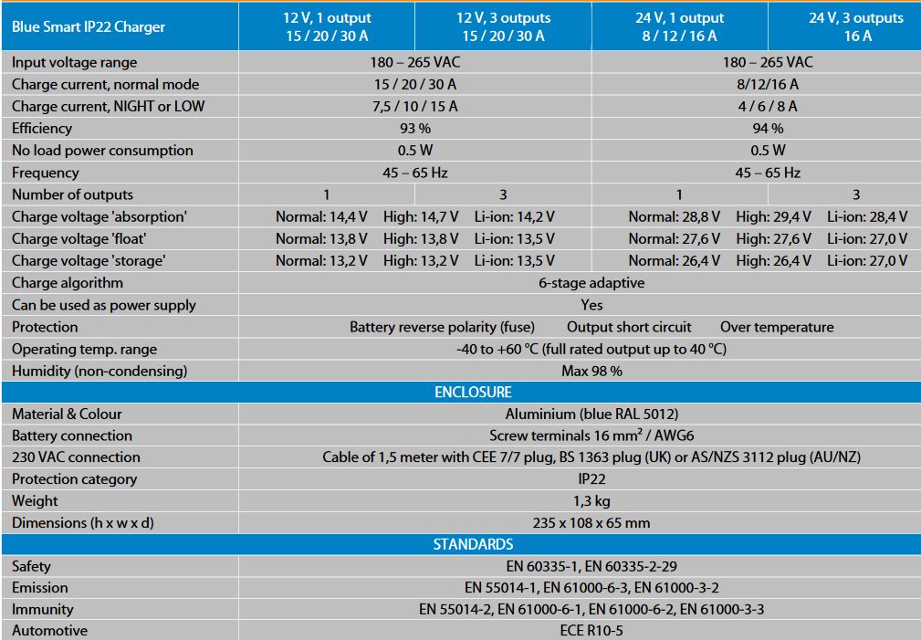 Protected against overheating – Output current will reduce as temperature increases up to 50 °C, but the Blue Smart Charger will not fail.