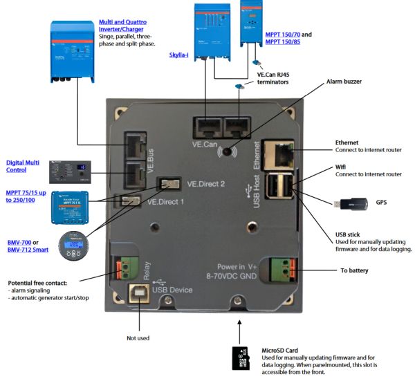 The Color Control GX is the communication-centre of your installation. It offers at-a-glance live information, and lets you control all products connected to it. Full system control is gained - almost anywhere in the world - by accessing your Color Control GX using our free-to-use Victron Remote Management Portal