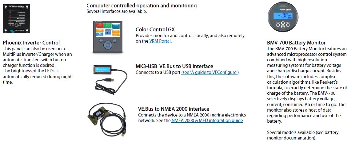 All models have a RS-485 port. All you need to connect to your PC is our MK2 interface. This interface takes care of galvanic isolation between the inverter and the computer, and converts from RS-485 to RS-232. A RS-232 to USB conversion cable is also available. Together with our VEConfigure software, which can be downloaded free of charge from our website, all parameters of the inverters can be customised. This includes output voltage and frequency, over and under voltage settings and programming the relay. This relay can for example be used to signal several alarm conditions, or to start a generator. The inverters can also be connected to VENet, the new power control network of Victron Energy, or to other computerised monitoring and control systems.