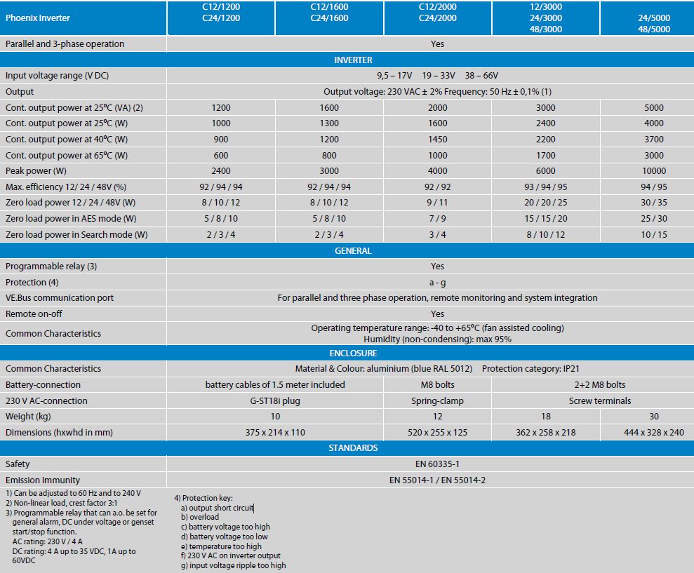 Developed for professional duty, the Phoenix range of inverters is suitable for the widest range of applications. The design criteria have been to produce a true sine wave inverter with optimised efficiency but without compromise in performance. Employing hybrid HF technology, the result is a top quality product with compact dimensions, light in weight and capable of supplying power, problem-free, to any load.