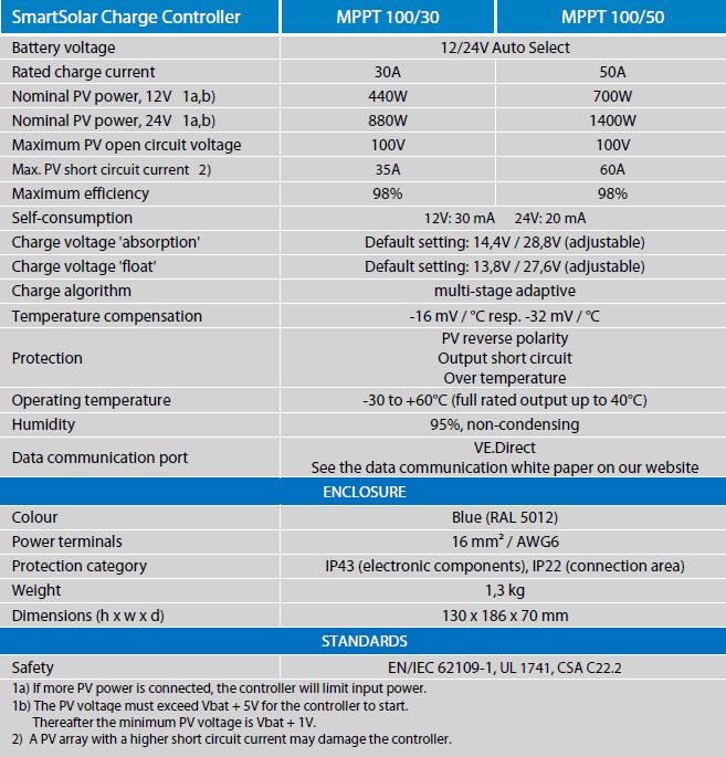 Max Charge Current 50A | Nom PV Input 700W@12V or 1400W@24V | Max PV Open Circuit Voltage 100V